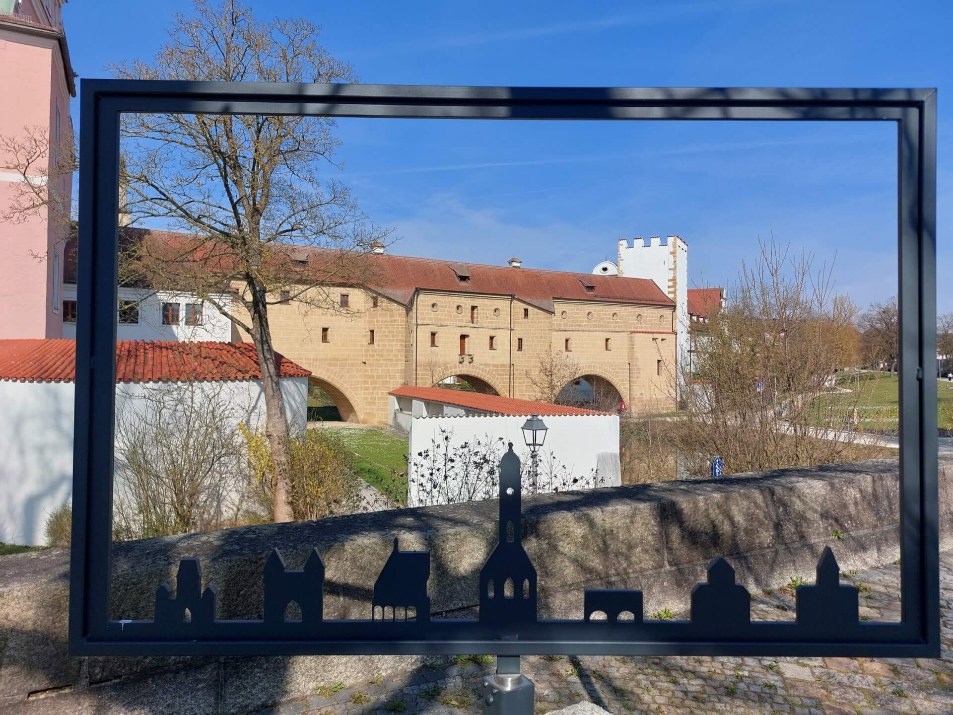 Auf der Vilsbrücke befindet sich ein drehbarer Fotospot der deinem Erinnerungsfoto einen besondern Rahmen gibt. Positioniere dich hier und drehe den Rahmen so, dass der gewünschte Ausschnitt im Hintergrund liegt.